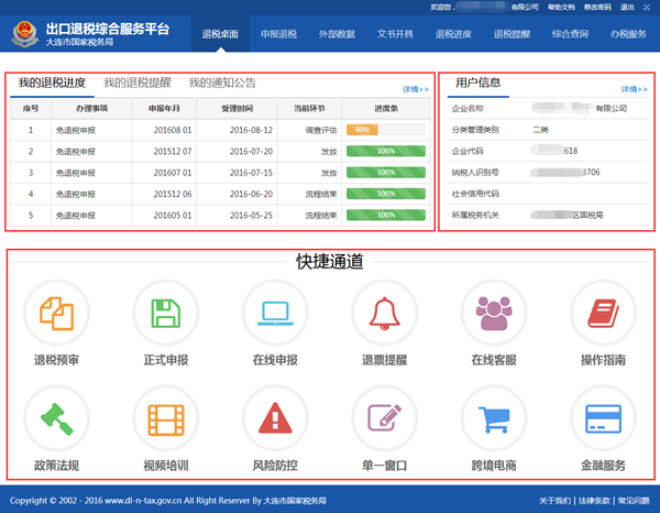 出口企业登录成功后可通过退税桌面获取通知区、信息区、快捷通道等相关内容。