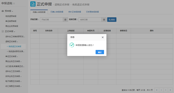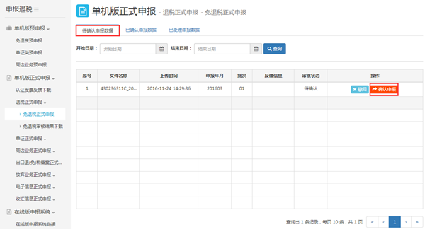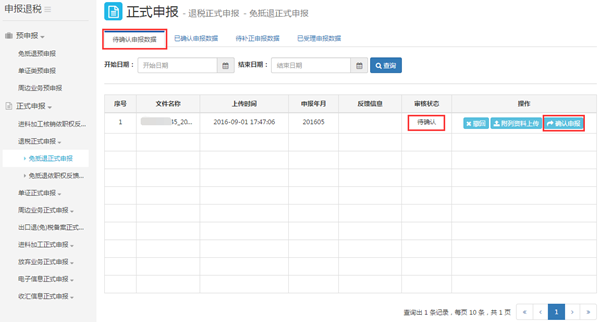点击“确认申报”按钮查看待确认正式申报数据台账信息。