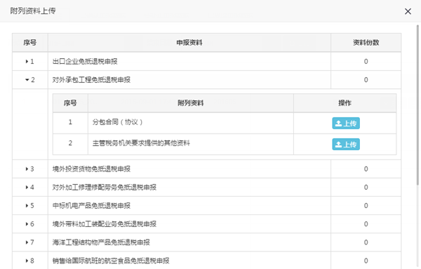 系统按照各地税务机关要求提供了详细的待申报的附列资料分项列表,出口企业只需要按照税务机关要求对应上传附列资料即可。