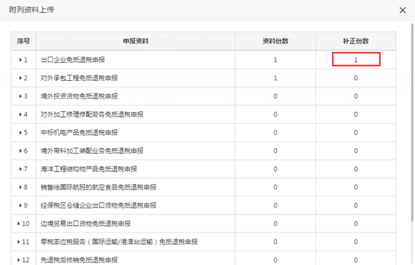 通过“补正份数”查看需要补正的资料份数,点击“补正份数”查看具体待补正的附列资料。