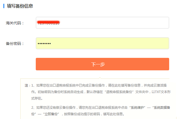 出口退税综合服务社区→点击“云激活”→填写“海关代码”、“备份密码”→点击“下一步”,根据提示完成激活。(备份密码即为单机版备份时生成的密码)。