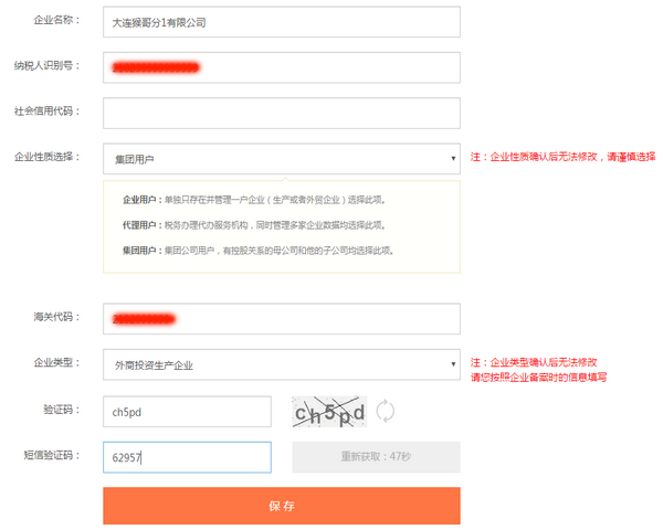 集团公司用户,有控股关系的母公司和他的子公司均选择该企业性质,完善资料时企业性质选择集团用户,填写总公司的企业名称、纳税人识别号、社会信用代码(依据企业实际情况是否填写)、海关代码、企业类型、验证码以及短信验证码。如图1-38所示: