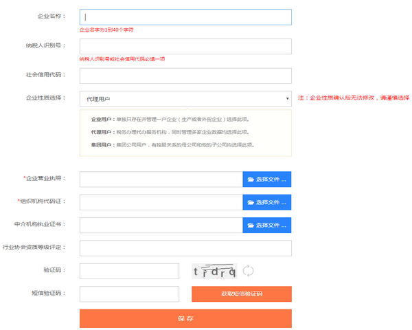 税务办理代办服务机构,同时管理多家企业数据均选择该企业性质,完善资料时企业性质选择代理用户,填写企业名称、纳税人识别号、社会信用代码(依据企业实际情况是否填写)、验证码以及短信验证码。如图1-41所示: