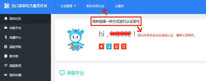 阳光会员是大连龙图信息技术股份有限公司为答谢广大出口退税企业的长久支持,特推出的免费办理活动,如已注册出口退税综合服务社区的用户,点击“阳光会员认证”或者“阳光会员点击此处进行认证”,出现弹出框输入“手机号号码”、“验证码”以及短信接收的“验证码”,进行认证。操作步骤同:“阳光会员认证”。如图1-47所示:
