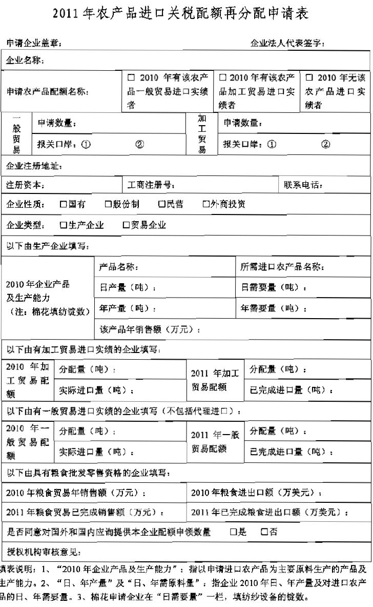 三、申请者需在9月1日至15日以书面形式向所在地省(自治区、直辖市、计划单列市)发展改革委、商务厅(外经贸厅)递交关税配额再分配申请。申请格式依照附件《2011年农产品进口关税配额再分配申请表》的有关规定填写。