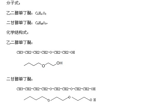 乙二醇单丁醚:无色透明液体,微有香味,相对密度(20℃/4℃)0.90075,沸点170.2℃,闪点(开口)74℃,接触明火、高热和强氧化剂有燃烧的危险。能溶于水、乙醇、丙酮、苯等有机溶剂,低毒。能溶解油脂、天然树脂、硝基纤维素等。
